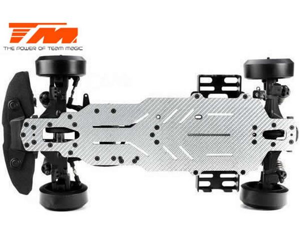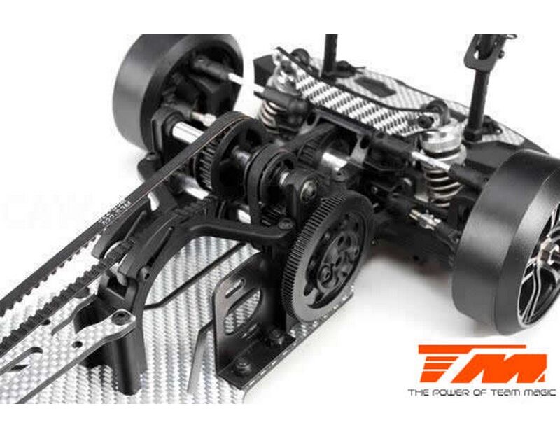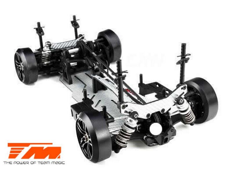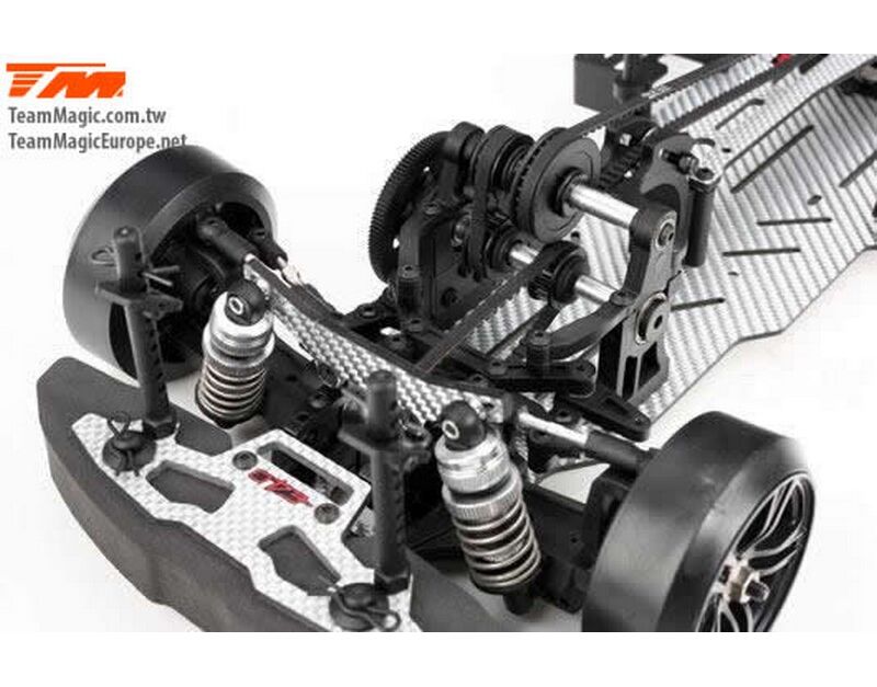 Werde ein Pro Drift Pilot mit dem Team Magic E4D-MF! Das Team Magic E4D-MF Design bietet eine perfekte Gewichtsbalance für bessere Kontrolle. Das Team Magic E4D-MF Drift Auto ist mit speziellen CVD-Antriebswellen vorne ausgestattet, um die Lenkgeschwindigkeit zu erhöhen. Das Modell bietet auch Countersteer-Option im Getriebe-Center, um individuelle Drehzahl vorne oder hinten einzustellen. Das untere und obere Deck besteht aus strapazierfähigem Silberfasermaterial. Es ist komplett mit Kugellagern für freies Rollen ausgestattet. Die Karrosserie besteht aus robustem Polycarbonat (Lexan) und enthält Leuchteimer, um LED-Leuchten zu installieren.