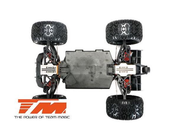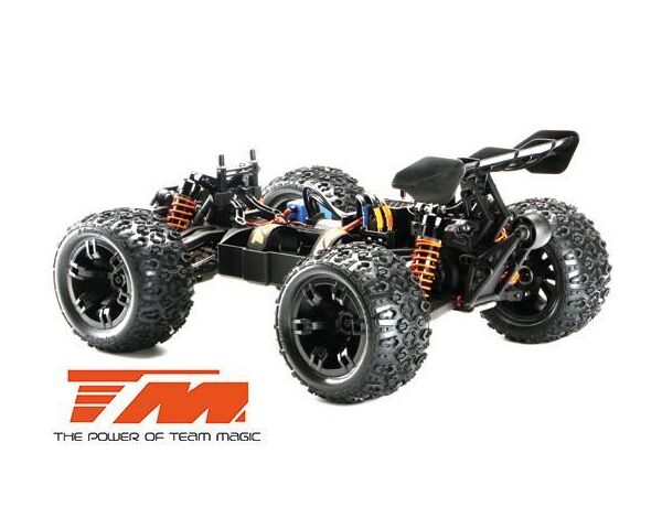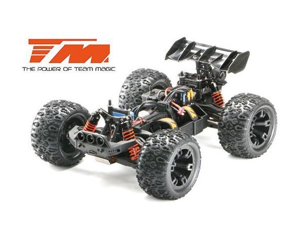 Der E5 HX ist der derzeit schnellste und stärkste 1:10 Racing Monster auf dem Markt. Der vordere Rammer ist mit drei weissen und zwei roten hellen LED's ausgestattet. Der Team Magic E5 HX beinhaltet eine schön geformte Racing Monster Karrosserie aus widerstandsfähigem Polycarbonate-Lexan um die innenliegenden Komponenten zu schützen. Robuste 14mm Radadapter helfen die hohe Kraftübertragung auf die griffigen K-Factory Reifen zu gewährleisten. Dies sorgt für bessere Fahreigenschaften und schnellere Beschleunigung auf allen Untergründen. Desweiteren ist ein einstellbares, robustes Wheelie-Bar (Stützrad) am hinteren Ende des Modells angebracht. Für eine bessere Kontrolle der Wheelies (Wheelie = auf zwei Rädern fahren), verfügt der Team Magic E5 HX über ein kugelgelagertes Wheelie-Rad. Sie werden es lieben!
