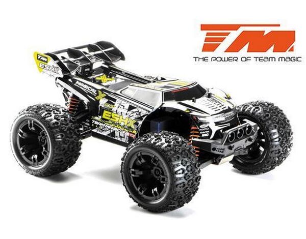 Der E5 HX ist der derzeit schnellste und stärkste 1:10 Racing Monster auf dem Markt. Der vordere Rammer ist mit drei weissen und zwei roten hellen LED's ausgestattet. Der Team Magic E5 HX beinhaltet eine schön geformte Racing Monster Karrosserie aus widerstandsfähigem Polycarbonate-Lexan um die innenliegenden Komponenten zu schützen. Robuste 14mm Radadapter helfen die hohe Kraftübertragung auf die griffigen K-Factory Reifen zu gewährleisten. Dies sorgt für bessere Fahreigenschaften und schnellere Beschleunigung auf allen Untergründen. Desweiteren ist ein einstellbares, robustes Wheelie-Bar (Stützrad) am hinteren Ende des Modells angebracht. Für eine bessere Kontrolle der Wheelies (Wheelie = auf zwei Rädern fahren), verfügt der Team Magic E5 HX über ein kugelgelagertes Wheelie-Rad. Sie werden es lieben!