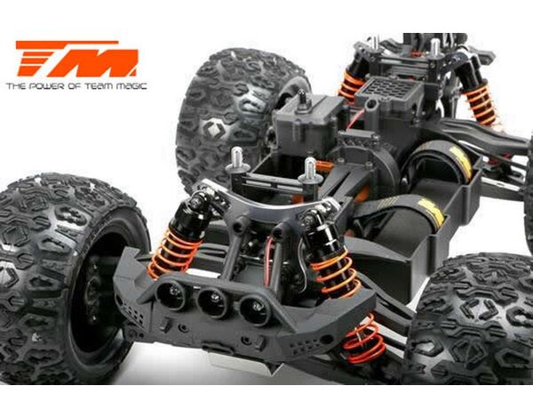 Der E5 ist der derzeit schnellste und stärkste 1:10 Monster Truck auf dem Markt. Der Team Magic E5 beinhaltet eine schön geformte Monster Truck Karrosserie aus widerstandsfähigem Polycarbonate-Lexan um die innenliegenden Komponenten zu schützen. Robuste 14mm Radadapter helfen die hohe Kraftübertragung auf die griffigen K-Factory Reifen zu gewährleisten; für bessere Fahreigenschaften und schnellere Beschleunigung auf allen Untergründen. Desweiteren haben wir ein einstellbares, robustes Wheelie-Bar (Stützrad) am hinteren Ende des Modells angebracht. Für eine bessere Kontrolle der Wheelies (Wheelie = auf zwei Rädern fahren), verfügt der Team Magic E5 über ein kugelgelagertes Wheelie-Rad. Sie werden es lieben!