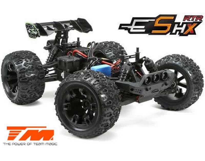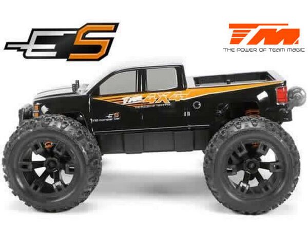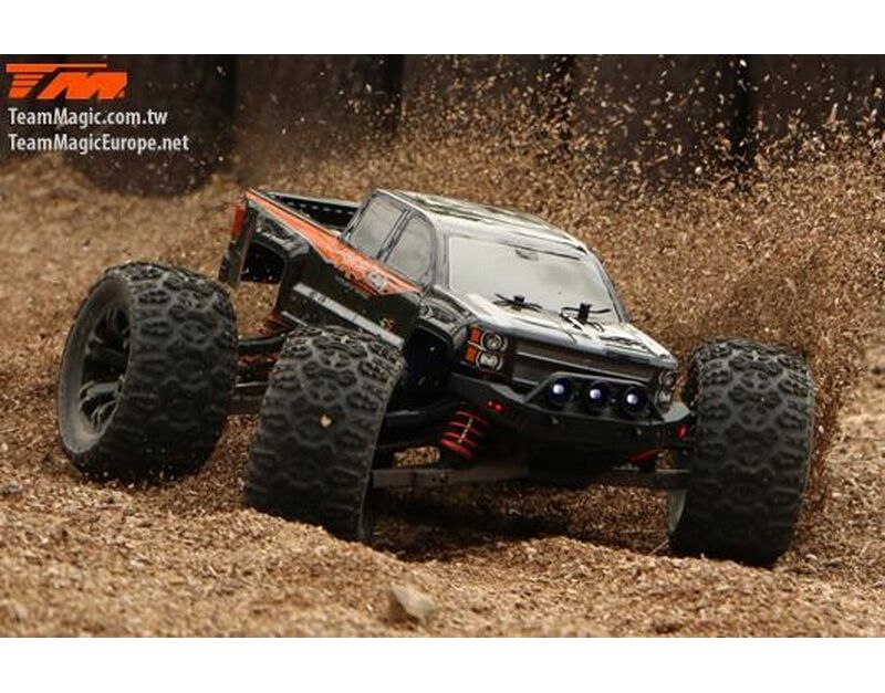 Der E5 ist der derzeit schnellste und stärkste 1:10 Monster Truck auf dem Markt. Der vordere Rammer ist mit drei weissen und zwei roten hellen LED's ausgestattet. Der Team Magic E5 beinhaltet eine schön geformte Pickup Monster Truck Karrosserie aus widerstandsfähigem Polycarbonate-Lexan um die innenliegenden Komponenten zu schützen. Robuste 14mm Radadapter helfen die hohe Kraftübertragung auf die griffigen K-Factory Reifen zu gewährleisten; für bessere Fahreigenschaften und schnellere Beschleunigung auf allen Untergründen. Desweiteren haben wir ein einstellbares, robustes Wheelie-Bar (Stützrad) am hinteren Ende des Modells angebracht. Für eine bessere Kontrolle der Wheelies (Wheelie = auf zwei Rädern fahren), verfügt der Team Magic E5 über ein kugelgelagertes Wheelie-Rad. Sie werden es lieben!