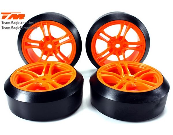 Team Magic Tires - 1/10 Drift - mounted - 5 Spoke Orange wheels - 12mm Hex - 45° - Hard (4 pcs)
