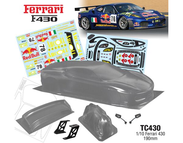TeamC 1/10 Ferrari F430 Tourenwagen Karosserie 190mm inkl. Anbauteile und Red Bull Stickerset