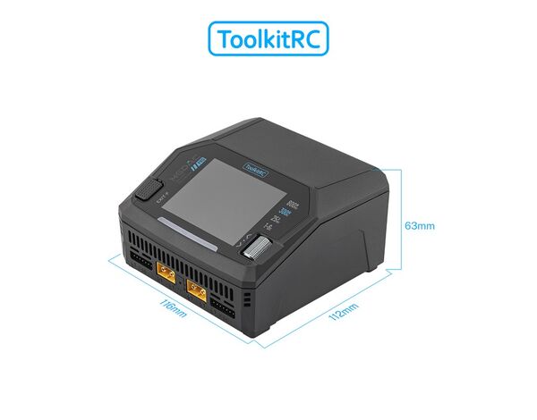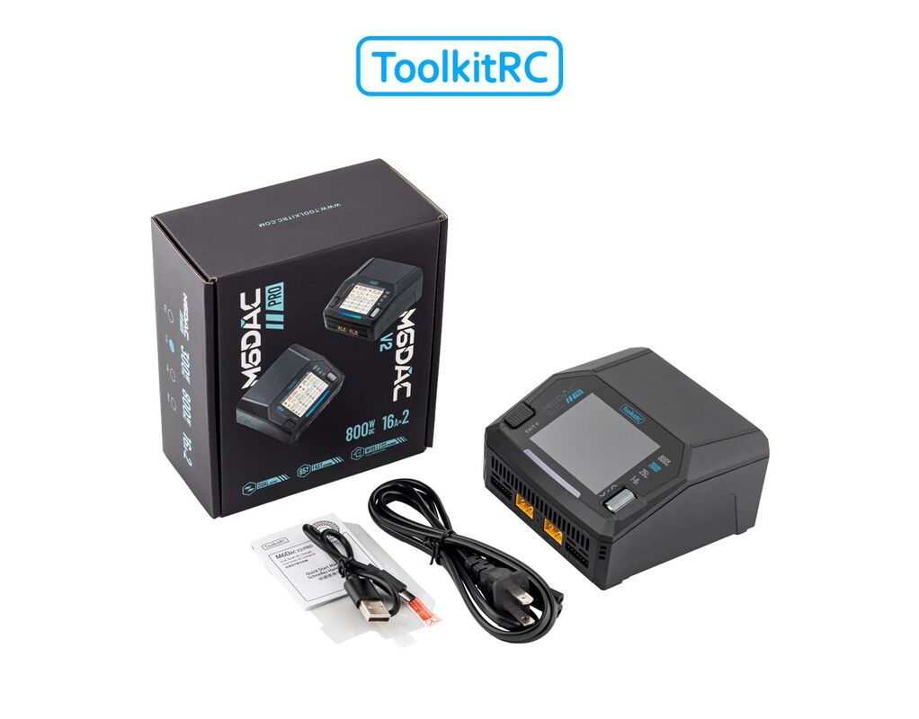 ToolkitRC M6DAC Pro LiPo 1-6S 16A 2 Kanal Ladegerät AC/DC 230V Das ToolkitRC M6DAC Pro ist ein kompaktes, duales Ladegerät ideal für hochleistungsfähige Lipo-Setups. Es unterstützt verschiedene Batteriechemien und bietet flexible Stromversorgungsoptionen sowie smarte Zusatzfunktionen wie kabelloses Laden und USB-C Quick Charge. Features: Dual-Channel Ladegerät mit integriertem AC-Netzteil (bis zu 300 W) DC-Betrieb von 728 V bis zu 400 W pro Kanal oder kombiniert 700 W / 28 A im synchronen Modus (DC-Eingang) Unterstützte Batteriesysteme: LiPo, LiHV, LiFe, Li-Ion, LTO (1-6S), NiMH (1-16S), Blei-Akkus (1-10S) Balancierstrom: ca. 1 A; hohe Balanciergenauigkeit < 0,005V Power-Supply-Modus mit einstellbarer Spannung und Strom kompatibel mit Smart-Batterien (z. B. DJI) USB-C Anschluss mit 65 W Fast Charging (unter anderem PD, QC, PPS, VOOC usw.) Kabelloses Laden von Mobilgeräten (Wireless Charging) Metall-Drehregler zur intuitiven Bedienung, LCD-IPS-Display Aktive Kühlung durch integrierten Lüfter Technische Daten: Eingang:AC 100240 V / DC 728 V (max. ca. 32 A) Ladeleistung:AC: bis 300 W; DC: 2×400 W (bis 16 A) oder synchron 700 W (bis 28 A) Balancierstrom / Genauigkeit:1 A; < 0,005 V USB-C:65 W (20 V / 3,25 A), QC/PD/VOOC usw. Kabelloses Laden:Ja (ca. 10 W) Anzeige:2,8" IPS LCD, 320 × 240px Abmessungen:ca. 116 × 112 × 63mm Gewicht:ca. 600 g