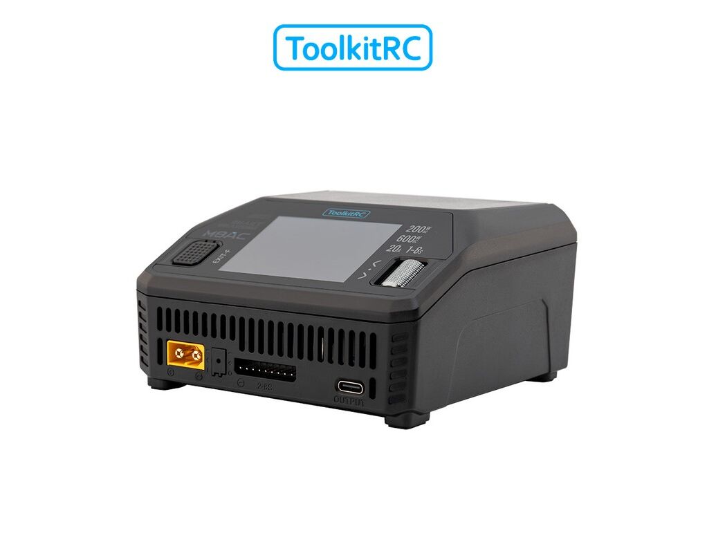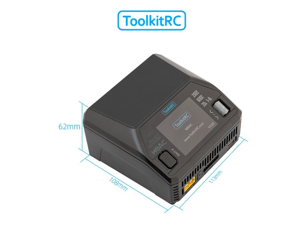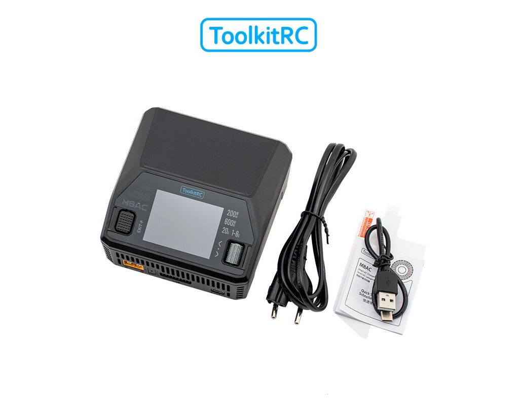ToolkitRC M8AC LiPo 1-8S 20A Ladegerät AC/DC Das ToolkitRC M8AC ist ein leistungsstarker und kompakter AC/DC-Lader für u.a. bis zu 8S Lithium-Akkus. Mit bis zu 200W über das integrierte Netzteil (AC) bzw. bis zu 600W an DC-Eingang sowie bis zu 20A Ladestrom versorgt es Akkus zuverlässig und schnell. Zusätzlich stehen eine 65W USB-C-Schnellladefunktion und zahlreiche Mess- und Testfunktionen zur Verfügung. Eigenschaften: Bis zu 600W (DC) bzw. 200W (AC) Ladeleistung Max. 20 A Ladestrom Breite Akku-Unterstützung: LiPo/LiHV/LiFe/Li-Ion/LTO (1–8 S), NiMH (1–20 S), Pb (1–12 S) Hoher Balancerstrom (1 000 mA) und Balance-Genauigkeit < 0,005 V 2,4″ IPS-Farbdisplay, übersichtliche Bedienung USB-C-Schnellladen bis 65 W (PD/QC u.a.) Zerstörungs-/Entlade-Modus für sichere Akkudepotenzierung Netzteil-/Labornetzteil-Funktion, Servo-/Signal-Tester (PWM/PPM/SBUS) Umfangreiche Schutzfunktionen & temperaturgeregelter Lüfter Technische Daten: Eingangsspannung:AC 100–240V @ max. 2,5A | DC 7–35V @ max. 25A Ladeleistung / -strom:AC bis 200W, DC bis 600W | 0,1–20A Entladen (intern):0,1–3A @ 20W (Normaler Modus) Entladen (Recycle):0,1–20A @ bis 600W (mit externer Last) Balancerstrom / -genauigkeit:1 000mA @ 4,2V | < 0,005 V USB:USB-C bis 20,0 V / 65 W (PD/QC u.a.), USB-A Zellenzahl: LiPo/LiHV/LiFe/Li-Ion/LTO1–8 S Zellenzahl: NiMH1–20 S Zellenzahl: Pb1–12 S Display:2,4″ IPS-LCD, 320×240 px Abmessungen:108 × 113 × 62mm Gewicht:ca. 500 g