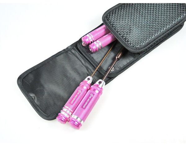 Primary metric tool set for most 1/10th car building and maintenance, made from machined premium grade Alum with hardened spring steel tool tip in a convenient carry case. This tool set is ideal for entry level to intermediate hobbyist looking to purchase their first set of professional rc tools or racers replacing old tool set with a more unified look plus the added convenience and tidier looking carry case.