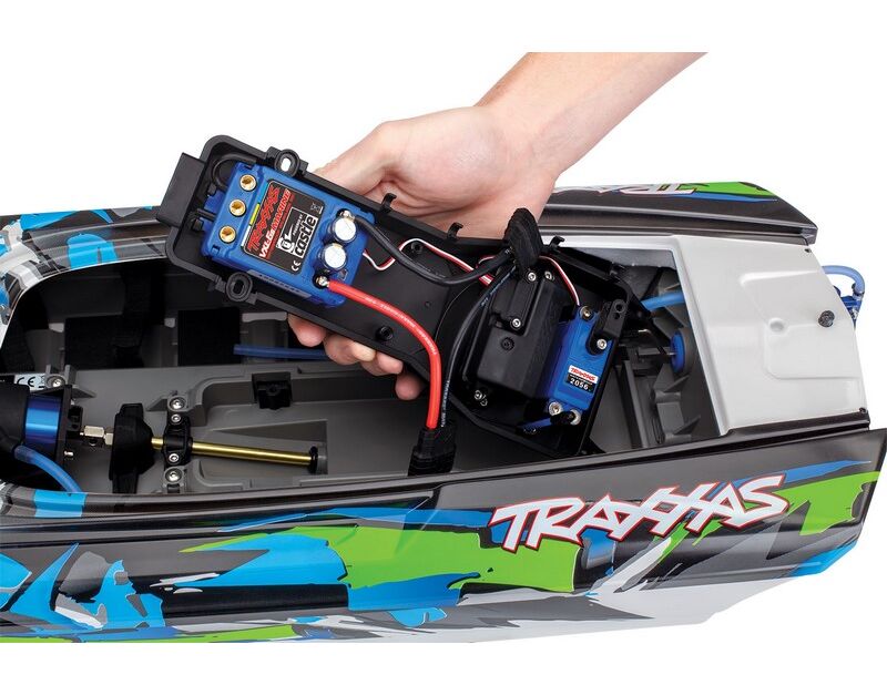 Die Traxxas DCB M41 GreenX Widebody Renn-Katamaran ist komplett montiert, Ready-To-Race, mit einer 2.4GHz Fernsteuerung, welche mit einem Traxxas Link Wireless Modul zusätzlich ausgestattet werden kann, ohne Akkus und ohne Ladegerät und wasserfester Elektronik!