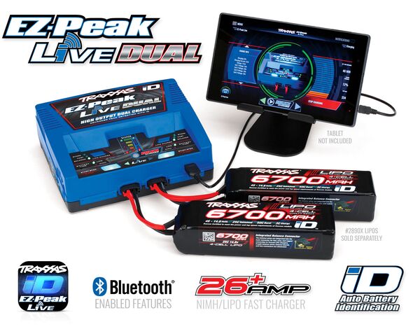 Das neue EZ-Peak® Live Dual iD Charger nutzt alle fortschrittlichen Funktionen des EZ-Peak Live und nutzt die Ausgangsleistung von über 26 Ampere (200 Watt)! Das 4s fähige Multi-Chemie-Doppel-Ladegerät verwendet integriertes Bluetooth, um nahtlos mit der neuen Traxxas EZ-Peak Live™ App für iOS und Android zu komunizieren. Die EZ-Peak Live App bietet Ihnen detaillierte Informationen, Fernüberwachung und erweiterte Bedienfunktionen über die hochauflösende Farbschnittstelle auf Ihrem mobilen Gerät. Es ist das leistungsstärkste und fortschrittlichste Ladegerät der beliebten EZ-Peak-Linie. Mit dem neuen EZ-Peak Live Dual Charger kommen Sie schneller wieder auf die Strasse!