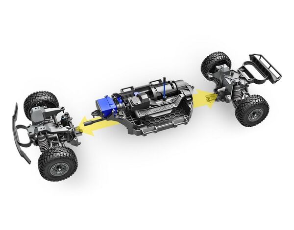 Dank des 1:10 4X4 Antriebsstrangs und Metallgetriebe-Planeten-Differentialen bietet er eine unglaubliche Geschwindigkeit von über 50km/h und lange Laufzeiten mit der enthaltenen 2s 3500mAh LiPo Batterie. Und das Beste: Mit dem VXL-3s Antriebssystem kannst du die Geschwindigkeit auf über 80 km/h steigern!