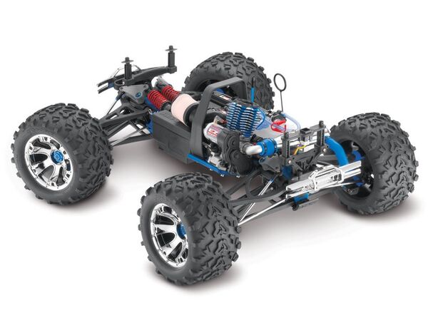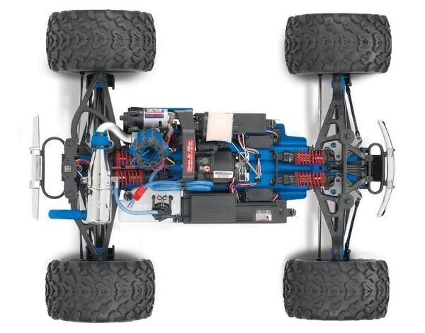 Revo's specifications are more than just an impressive list of features. They are each specifically engineered and integrated into the model to provide capability and convenience that equates to fun! Revo 3.3's heavy-duty reversing transmission lets you easily back out of tight spots with the flick of a switch, while the OptiDrive® Electronic Transmission Control guarantees safe, smooth engagement every time. Revo engineering makes it the smoothest reversing system available on any nitro truck. The Traxxas TQi 2.4GHz radio system features the exclusive Traxxas Link wreless Module, a revolutionary concept that harnesses the power of your Android, Apple iPad, iPhone or iPod touch to create the ultimate pro-caliber radio system. The TQi™ radio system keeps you in complete control with the latest 2.4GHz technology for no-crystals-required reliability and convenience. Just switch on and drive. Geode™ chrome wheels with 17mm hex hubs wear massive 6.3" Maxx®-sized tires for big ground clearance and total traction in all conditions. Revo 3.3's dual-digital servo steering system delivers 250 oz.-in of torque for powerful, responsive handling, plus they're waterproof for ultimate reliability. The Revo 3.3 is 100% Ready-To-Drive®—even a fuel dispensing bottle and rechargeable NiMH packs for the receiver and EZ-Start system are included, along with the chargers, extra oil filter, extra glow plug, precision tool set, and more! All the race-engineered advantages that make Revo a seven-time national champion on the track also make it the ultimate platform for all your monster truck fun. Revo durability is second to none, once the long travel rockers are installed, Revo has the most suspension travel of any monster truck.