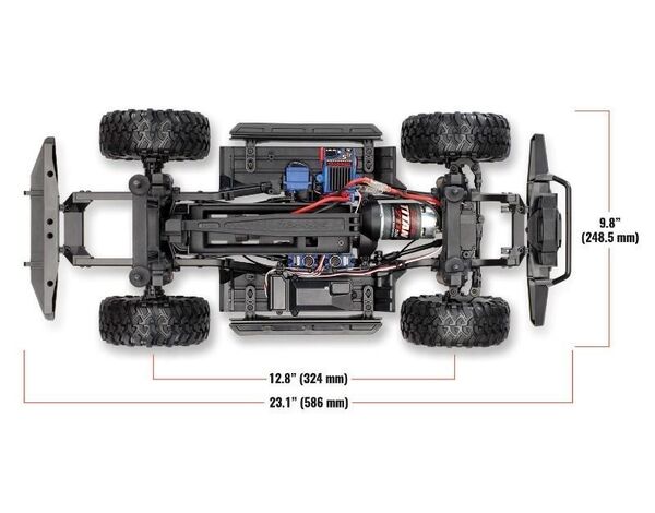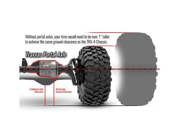 The TRX-4 Scale and Trail Crawler is equipped right out of the box with Traxxas' game-changing portal axle set. Portal axles lift the truck at the wheels for huge center pumpkin ground clearance. In order to achieve the same clearance with straight axles (and not get stuck), your tires would have to be over an inch taller than the TRX-4's tires. Straddling boulders with ease, the TRX-4 chassis definitely takes the path less travelled and simply leaves all the others behind.