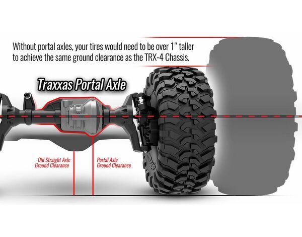 Der TRX-4 erreicht durch seine innovativen Portalachsen mehr Bodenfreiheit als andere Fahrzeuge. Die Räder sind durch eine Getriebeuntersetzung am äußersten Punkt tiefer positioniert.