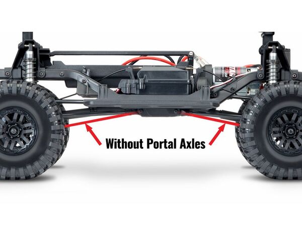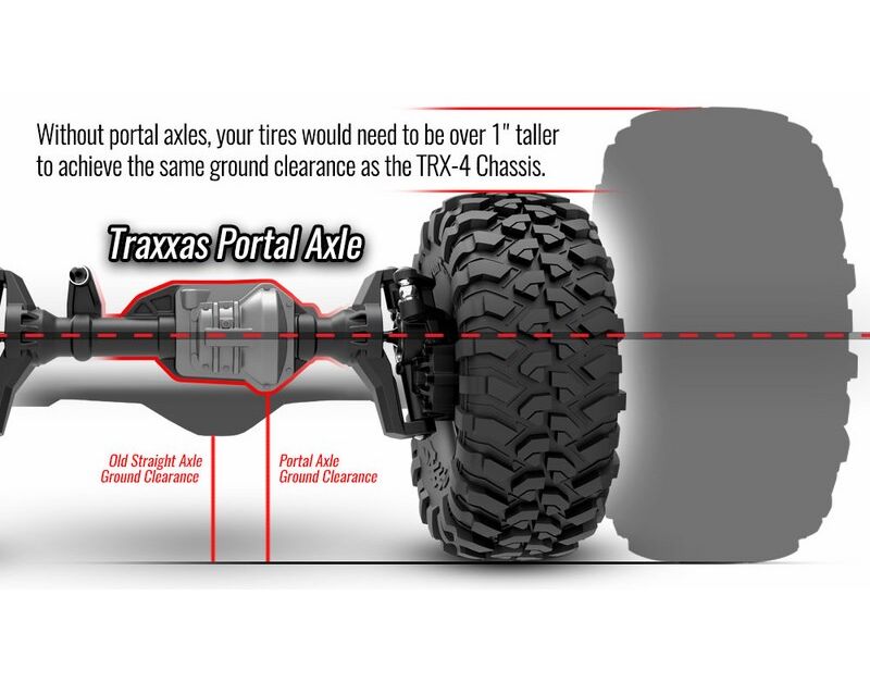 The portal axles use gear reduction right at the wheels that dramatically reduces undesirable torque twist. Total axle gear reduction is over twice non-portal designs. The Titan 550 motor torque is translated into straight, powerful, forward motion, rather than wasted energy twisting your rig right off the rocks.