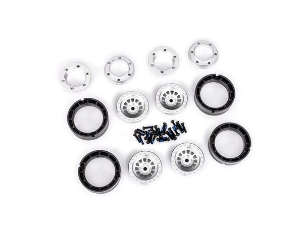 Räder, 1.0", 6061-T6 Aluminium (silber-eloxiert) (4)/ 2x8mm BCS (24) Bringen Sie Ihren TRX-4M™ auf das nächste Level mit diesen silber-eloxierten Aluminium Beadlock Rädern. Diese funktionellen 1″ Beadlock-Räder aus robustem 6061-T6 Aluminium sehen an Ihrem TRX-4M großartig aus und bieten maximalen Grip auf dem Reifenwulst. Die Beadlock-Räder passen auf die serienmäßigen TRX-4M-Reifen und die optionalen 9782 Mickey Thompson® Baja Pro X® Offroad-Reifen. Fügen Sie die optionalen 9780 Messing-Radgewichte hinzu, um Ihrem TRX-4M noch mehr Stabilität für schwierige technische Manöver zu verleihen. Enthält innere und äußere Felgen (4), Mitteltrommeln (4) und 2x8 mm Befestigungsschrauben (24).