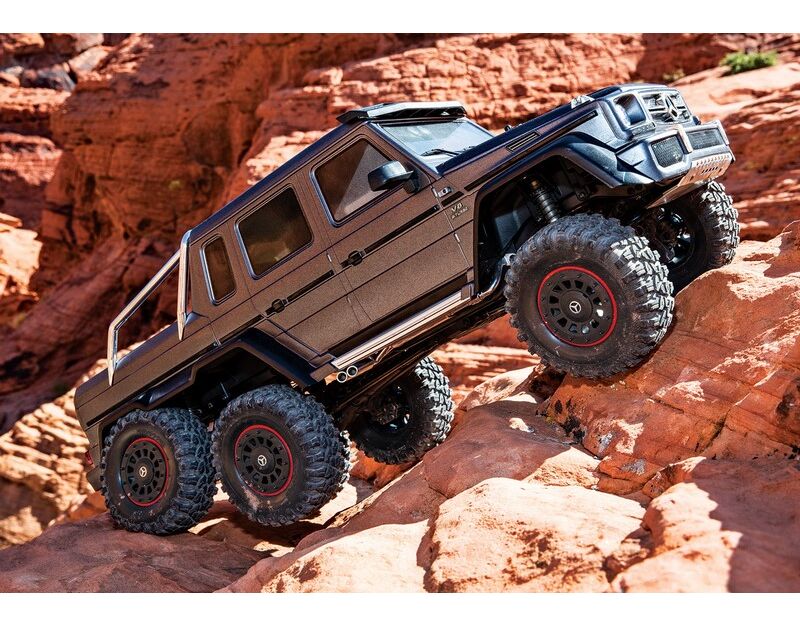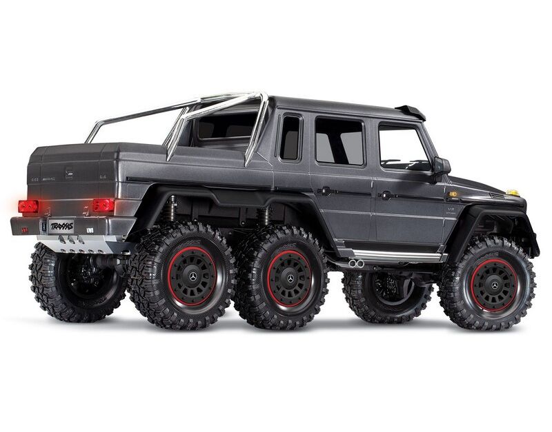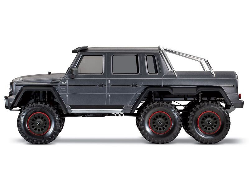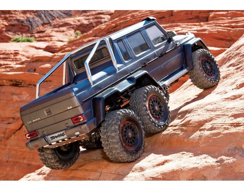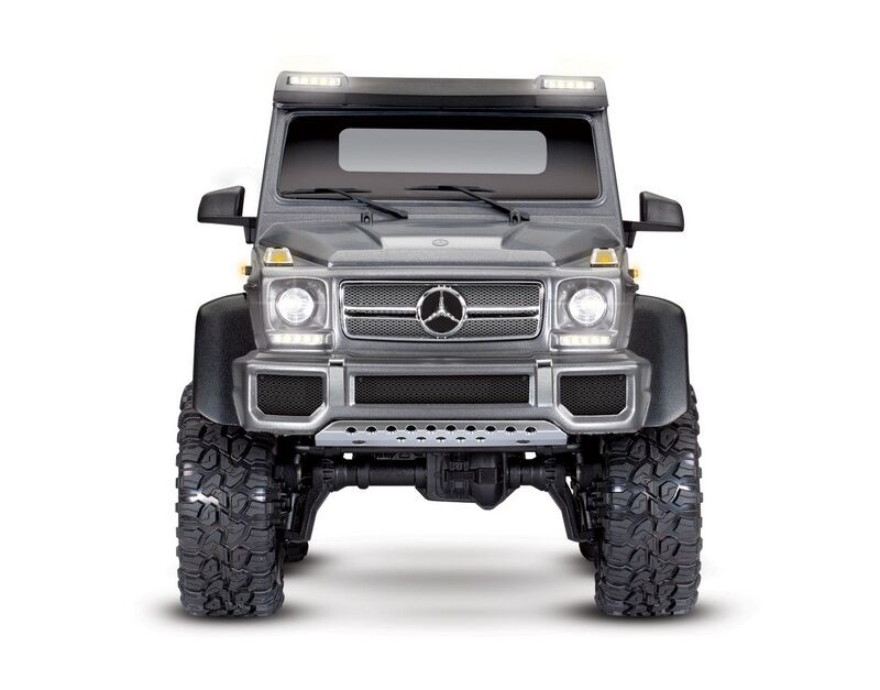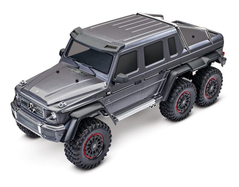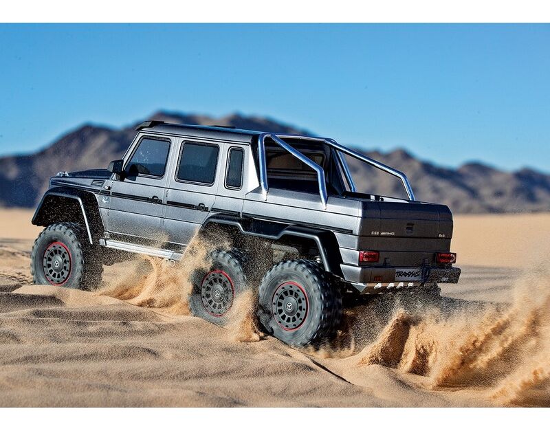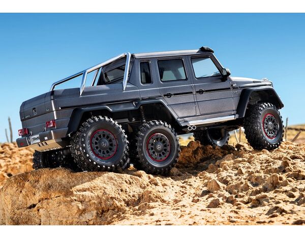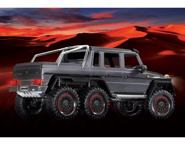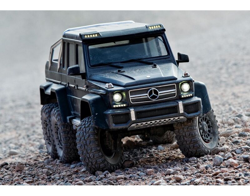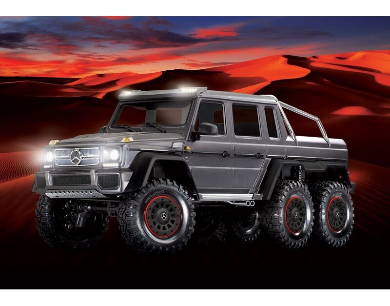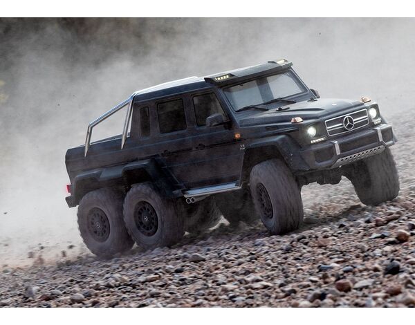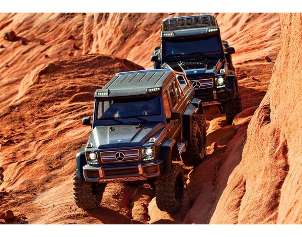 The Mercedes-Benz G 63 AMG 6x6 TRX6 represents a singular vision to create the boldest and toughest all-terrain vehicle ever. Traxxas captures the spirit and no-compromise approach of the Mercedes-Benz G 63 AMG 6x6 with an officially licensed detailed scale replica built on the proven TRX-6 platform. Six drive wheels, three T-Lock™ remote-locking differentials, portal axles, high/low transmission, 6 aluminum long-travel shocks, and a stunningly accurate body with brilliant LED lighting make this the most advanced and capable RC crawler ever to hit the trail.