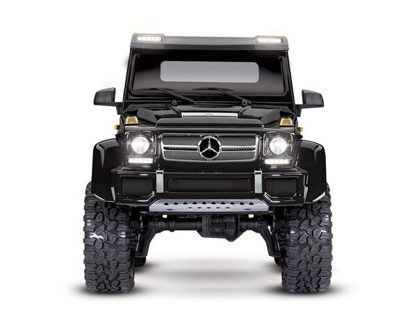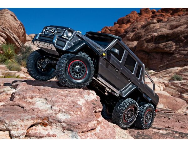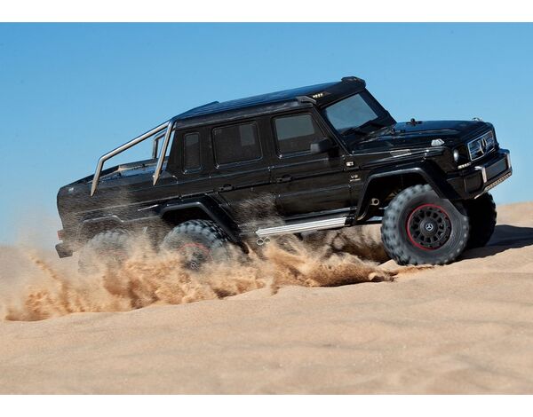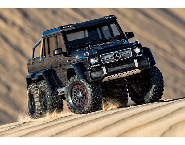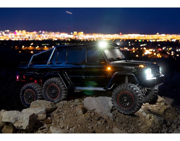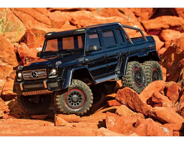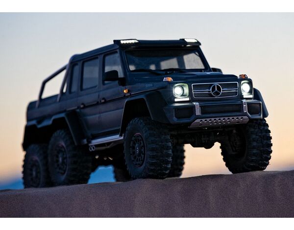 The Mercedes-Benz G 63 AMG 6x6 TRX6 represents a singular vision to create the boldest and toughest all-terrain vehicle ever. Traxxas captures the spirit and no-compromise approach of the Mercedes-Benz G 63 AMG 6x6 with an officially licensed detailed scale replica built on the proven TRX-6 platform. Six drive wheels, three T-Lock™ remote-locking differentials, portal axles, high/low transmission, 6 aluminum long-travel shocks, and a stunningly accurate body with brilliant LED lighting make this the most advanced and capable RC crawler ever to hit the trail.