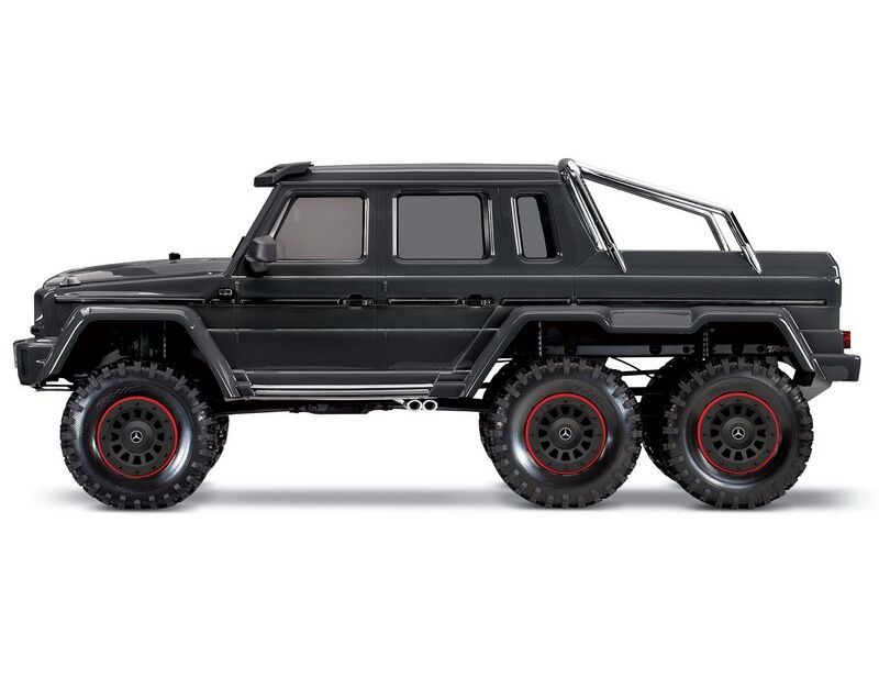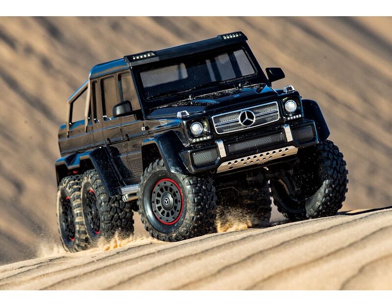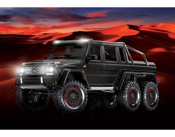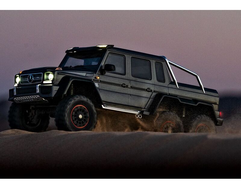 The Mercedes-Benz G 63 AMG 6x6 TRX6 represents a singular vision to create the boldest and toughest all-terrain vehicle ever. Traxxas captures the spirit and no-compromise approach of the Mercedes-Benz G 63 AMG 6x6 with an officially licensed detailed scale replica built on the proven TRX-6 platform. Six drive wheels, three T-Lock™ remote-locking differentials, portal axles, high/low transmission, 6 aluminum long-travel shocks, and a stunningly accurate body with brilliant LED lighting make this the most advanced and capable RC crawler ever to hit the trail.