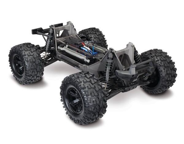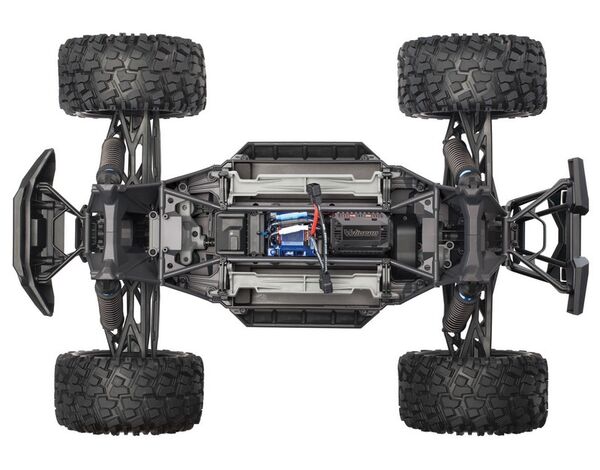 Seine massiven Reifen versprechen enormen Griff auf jedem Terrain, die ölgefüllten Alu-Stoßdämpfer tun ihr Übriges um den X-Maxx auf jedem Untergrund ideal zu bewegen. Trotz des großen Federweges ist der Wendekreis gering.