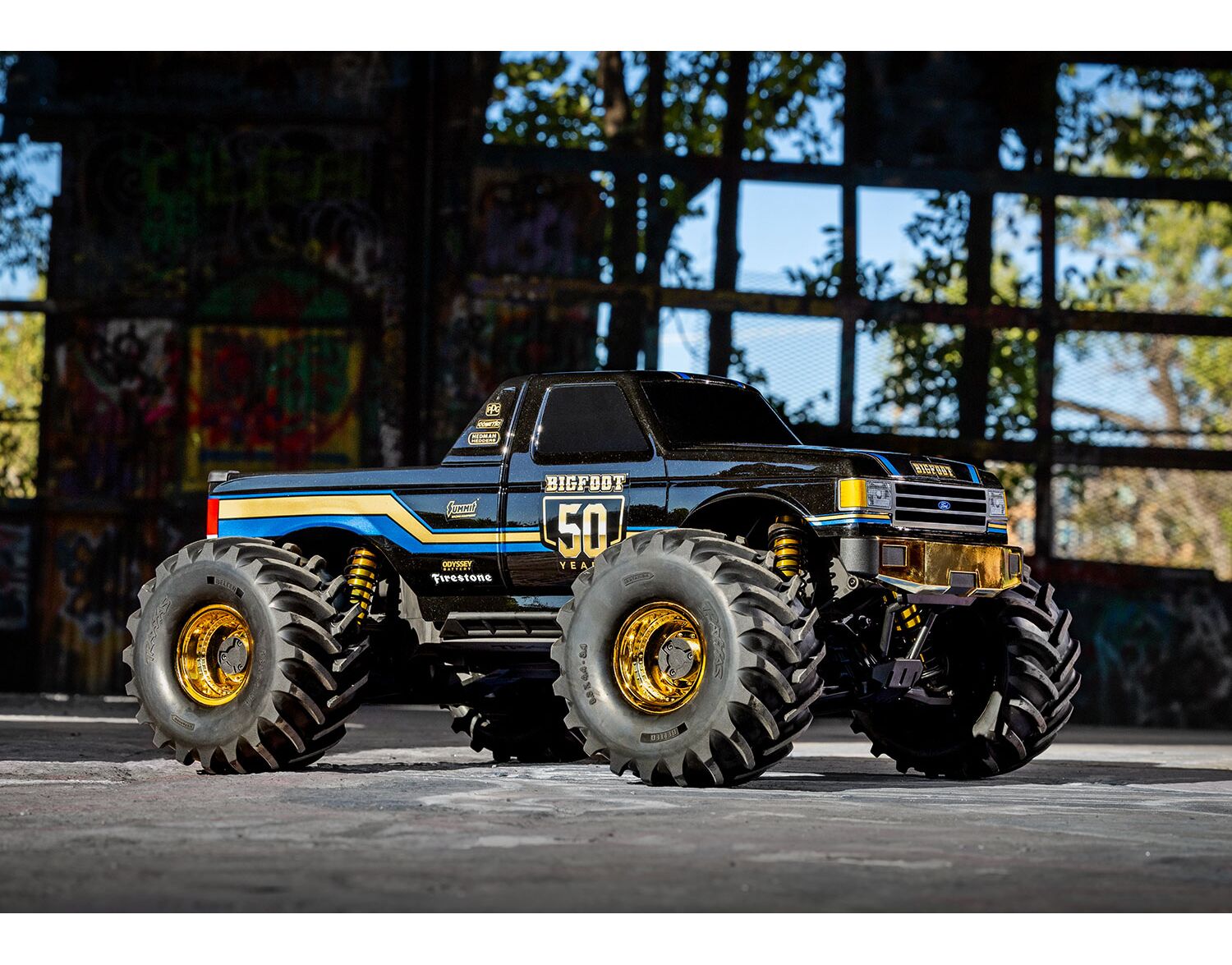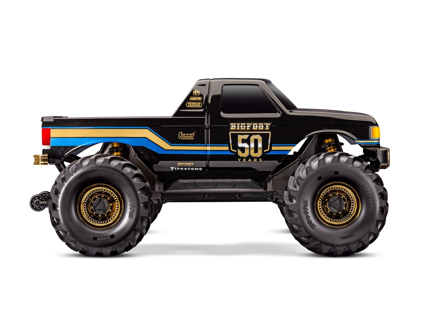 Traxxas feiert die 50-jährige Geschichte von BIGFOOT mit 1.975 nummerierten Trucks, die jeweils mit einer lasergravierten Aluminiumplakette mit der Seriennummer sowie passenden Aluminiumemblemen an Karosserie und Fahrgestell versehen sind. Die Jubiläumskarosserien und goldenen Zubehörteile sind nicht separat erhältlich.