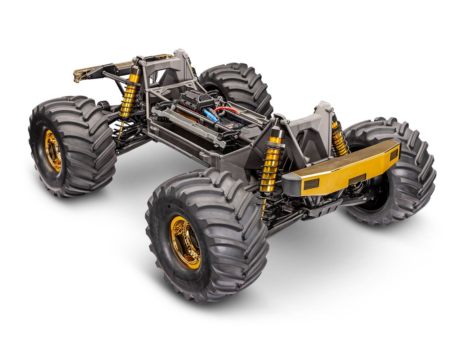 BIGFOOT 50th verfügt über exklusive goldeloxierte Stossdämpfer, Achsen und einen Motor-Kühlkörper. Die Stossfänger und Räder sind ebenfalls in passendem Gold gehalten und sorgen für einen einzigartigen Look. Selbst der Velineon VXL-8s ESC ist aus schwarzem Kunststoff gefertigt, passend zum Motor. Diese limitierten Teile sind nur bei BIGFOOT 50th erhältlich und werden nicht separat angeboten.