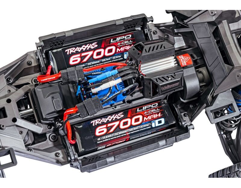 Traxxas recommends dual 4-Cell, 6700 mAh Power Cell LiPo batteries (part #2890X) or the Dual 4s Completer Pack (Part #2997).