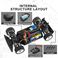 Die feinfühlige 2,4GHz Fernsteuerung vermittelt ein sehr direktes Fahrgefühl. Das schnelle und kräftige Lenkservo sorgt zusätzlich für ein präzises Handling und der starke 4WD Antrieb in Verbindung mit dem großen Akku (7,4V Li-Ion 1200mAh) ermöglicht lange Fahrzeiten bei einer Höchstgeschwindigkeit von ca. 30km/h.