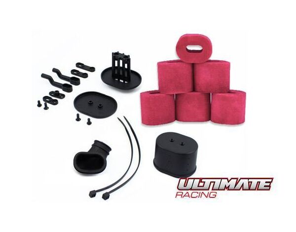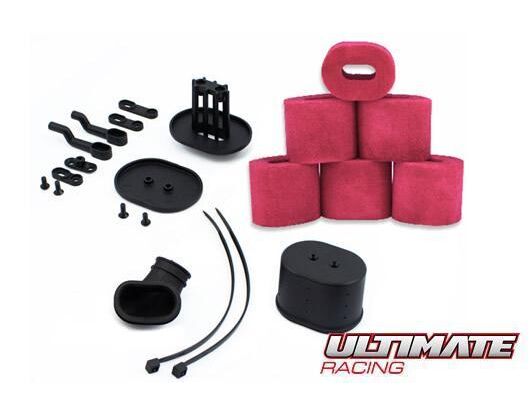 Dies ist der AIRMAX-Luftfilter mit 6 vorgeölten Filterschäumen von Ultimate Racing. Das AIRMAX-Konzept zielt darauf ab, einen maximalen Luftstrom zum Vergaser zu erreichen und gleichzeitig die Außenabmessungen des Filters so zu gestalten, dass er für die meisten 1/8-Offroad-Fahrzeuge und Karosserien geeignet ist. Dies wird durch ein kurzes, konisches Gummiverbindungsrohr mit großem Durchmesser erreicht, das den Luftstrom beschleunigt, sowie durch eine interne Filterstruktur mit größerer Oberfläche, ohne den Motorschutz zu beeinträchtigen. Das Ergebnis ist eine spürbare Steigerung der Motorleistung und des Fahrverhaltens.