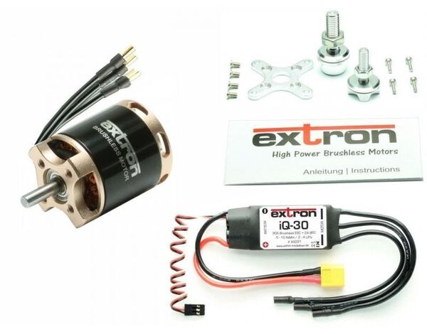 Extron Brushless Set bestehend aus: 1 x Extron Brushless Motor 2220/20 1 x Extron Brushless Regler iQ-30 Extron Modellbau kann auf eine über 30-jährige Erfahrung in Elektroantrieben zurückblicken. Das Ziel bei der Entwicklung der Extron Brushless Motoren war es, dem Kunden hohe Qualität zum günstigen Preis anbieten zu können. Jeder einzelne Motor wird vor Auslieferung getestet so daß wir sicherstellen können, daß nur einwandfreie Motoren in die Hände unserer Kunden gelangen. Schnellübersicht Extron Motoren (auf das Bild klicken) Produktmerkmale * Handgewickelte, bürstenlose Außenläufer Motoren * Hoch hitzefeste Neodym Magnete * Ausgezeichnete Verarbeitung * Sorgfältige Materialauswahl * Zuverlässige, hohe Leistung * Dynamisch feingewuchtet für optimale Laufruhe * Extra große Ø 12mm Qualitäts Kugellager für höchste Lebensdauer * Perfekte