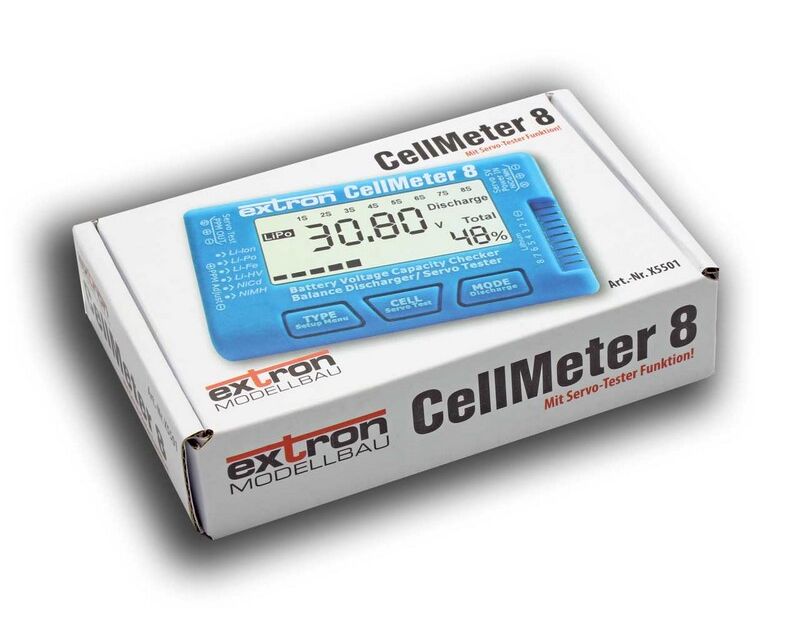 Das Cell Meter 8 ist ein Multifunktions-Messgerät, mit dem die Kapazität Ihrer Akkus sowie die Einzelzellenspannung messen können. Darüberhinaus kann das Cell Meter 8 Ihre Lithium Akkus balancieren und Ihre Servos testen. Nettes Feature am Rande: Das Gerät verfügt über eine sehr schöne, helle Hintergrundbeleuchtung.