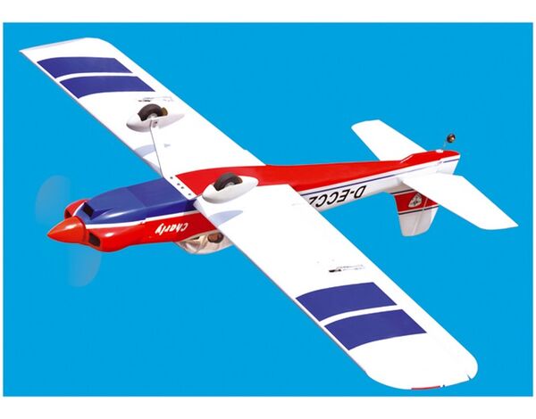 Dank moderner Herstellungsmethoden wie dem Laserschneiden der Bauteile und ausgesuchten, leichten Materialien. Ein moderner Brushless-Elektroantrieb trägt ebenfalls zur enormen Gewichtseinsparung bei. Das Abfluggewicht konnte daher um etwa 1000g (Sie lesen richtig: 1 Kilogramm) reduziert werden. Die breite Motorhaube sorgt heute wie damals im Kunstflug bei Abwärtsfiguren für eine leichte Bremswirkung und somit für ein ruhiges und gleichmäßiges Flugbild.