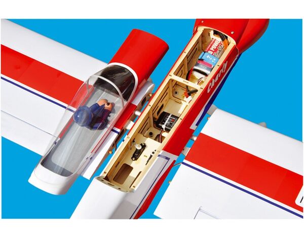 Dank moderner Herstellungsmethoden wie dem Laserschneiden der Bauteile und ausgesuchten, leichten Materialien. Ein moderner Brushless-Elektroantrieb trägt ebenfalls zur enormen Gewichtseinsparung bei. Das Abfluggewicht konnte daher um etwa 1000g (Sie lesen richtig: 1 Kilogramm) reduziert werden. Die breite Motorhaube sorgt heute wie damals im Kunstflug bei Abwärtsfiguren für eine leichte Bremswirkung und somit für ein ruhiges und gleichmäßiges Flugbild.