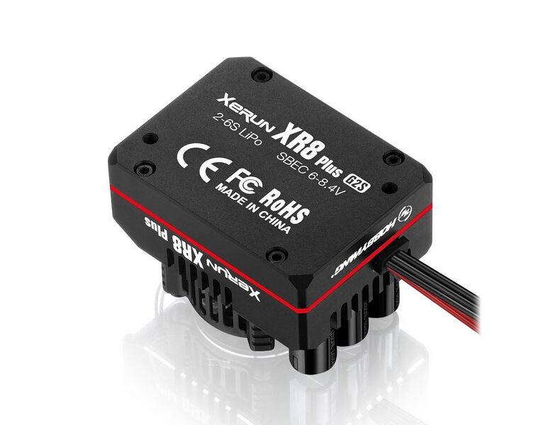Ausgelegt zur Nutzung für 2-6S LiPos-Akkus sind die ultra-weiche Kabelführung aus 11AWG-Kabeln, die eigens designten Lötfähnchen sowie das edle Aussehen an sich Beispiele für die hochwertige Verarbeitung. In Sachen Funktionalität glänzt der XR8 Plus G2S mit einem erweiterten BEC von 6-8,4V in 0,1-Schritten, denn so ist eine große Bandbreite an Servos ansprechbar.