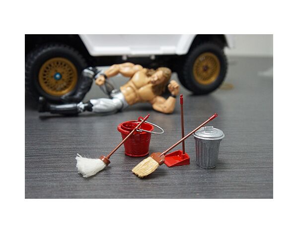 This is Yeah Racing 1/10 RC Crawler Garage Accessory Combo w/ Broom, Dustpan, Mop, Water Bucket, Metal Trash Bin.