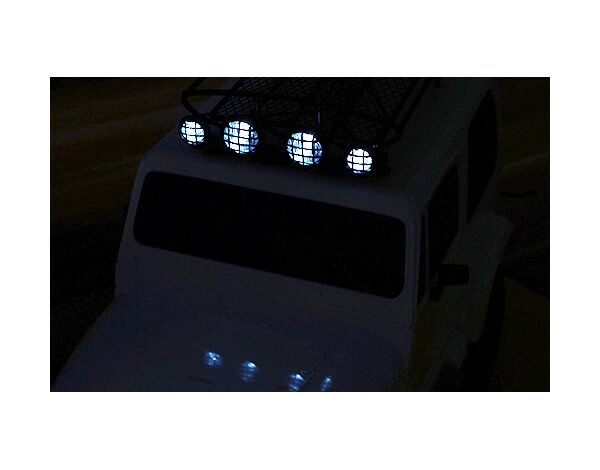 Dachträger mit LED Scheinwerfer. Realistisches Zubehör zur Dekoration von allen 1/10 Scale Crawlern wie z.B. TAMIYA CC-01, CR-01, AXIAL Wraith, TAMIYA Ford 350 Highlift, AXIAL SCX 10 Honcho, TRAXXAS TRX-4