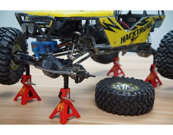 This Yeah Racing 1/10 RC Rock Crawler Accessory Height Adjustable 6 Ton Pack comes in pairs, featuring realistic look and similar functions like the real thing! They can support and hold most cars and trucks safetly off the ground, prefect for RC repair work or storage. It is made of metal, portable and tough, making these heavy duty jack stands the perfect addition to your RC garage or auto shop.