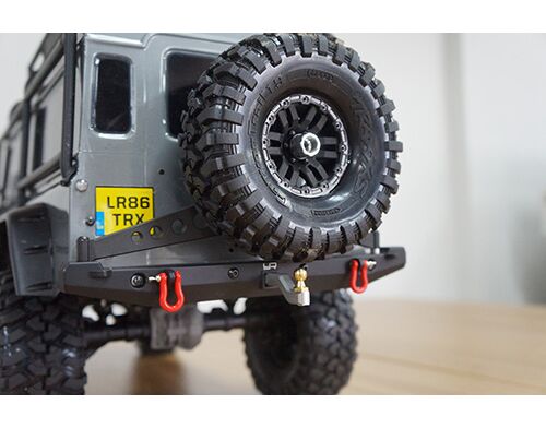 Alu Stossfänger hinten mit Beleuchtung für Traxxas TRX 4, Axial SCX 10 und SCX 10 II mit Reserverad Halterung und mit Anhängerkupplung