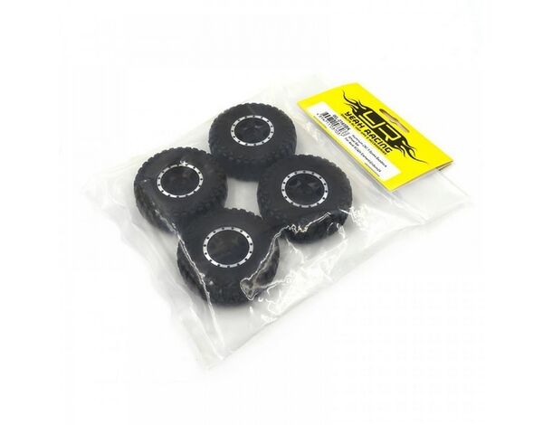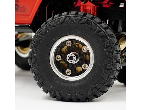 Beadlock rims with a graphite center locking ring, to keep the rotating mass lower for a more stable climb when you punch the throttle. Comes with a wheel hub, so you can take it out of the packet mount tires and go crawling!