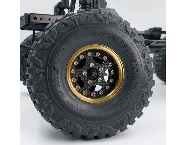Beadlock rims with a graphite center locking ring, to keep the rotating mass lower for a more stable climb when you punch the throttle. Comes with a wheel hub, so you can take it out of the packet mount tires and go crawling!