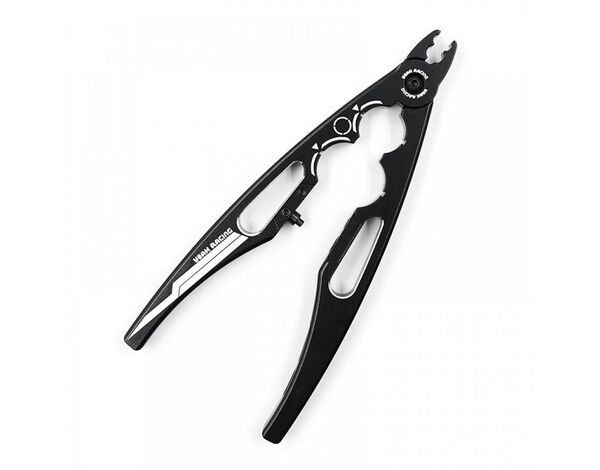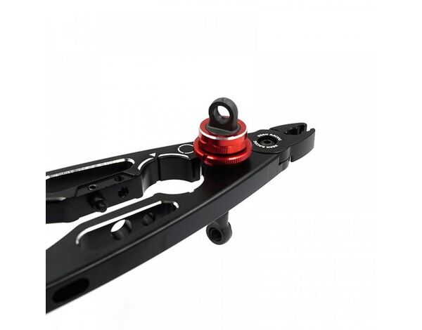 Aluminum multi function shock pliers for adjusting and building your dampers! Features different cutouts for a large variety of tasks, such as holding onto shock shafts (7mm length min.), shock body and even building turnbuckles!