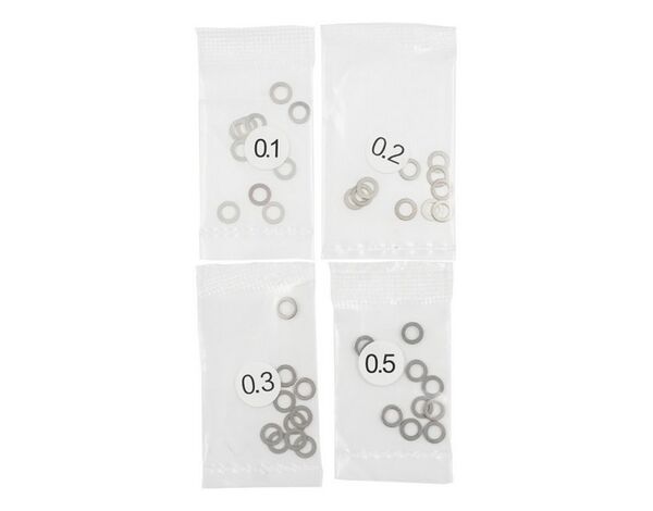 Stainless steel spacer set for fine tuning the fitment of different parts, be it steering or even diff spacing to ensure a longer lasting drivetrain! Increments in 0.1mm, which allows you to get perfect play shimmed out.