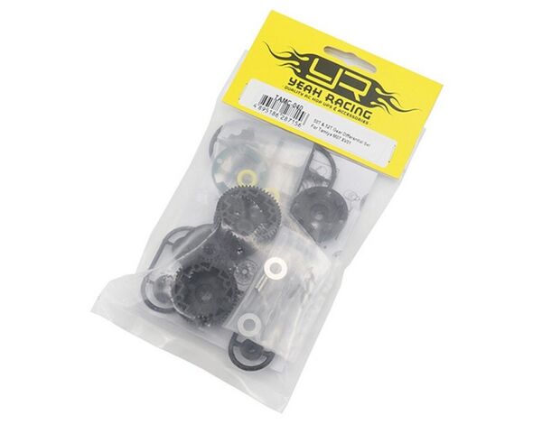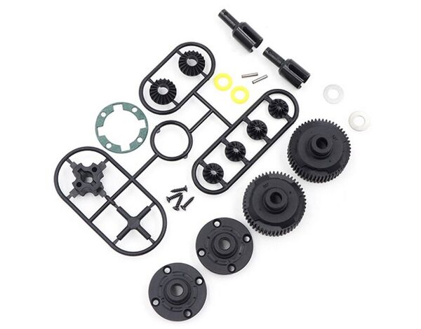 Competition grade Gear Differential featuring two different diff halves which allows the running of different internal ratios for either running stock ratio or a lower and thus resulting in higher top speed. Steel outdrives for low wear and direct power transfer!