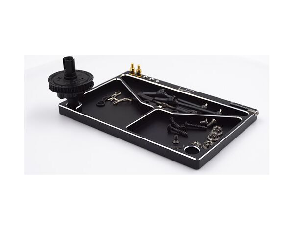 Keep your screws and small parts neatly and organized with this three compartment Aluminum Parts Tray! Banana plug compartment to help you solder plugs and two separate holes at the bottom for securing gear differentials during maintenance!