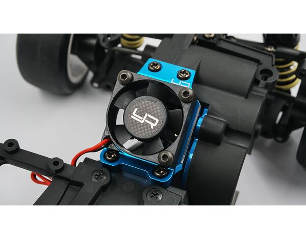 Aluminum fan mount which also seconds as a chassis stiffener, being of aluminum assists in dissipating heat generated by the motor! A 30mm Tornado Yeah Racing blows onto the motor to keep things cool!