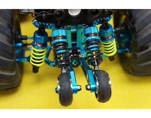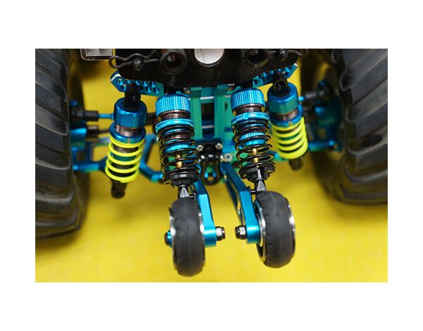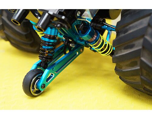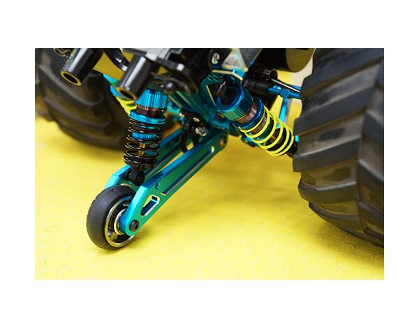 Introducing the Shock Absorb Wheelie bar with DSG Shock Gear Damper, install this option part for either your WR02, WR02G or GF01 to increase the ease to pop wheelies. Besides making it easier to do wheelies, it also allows for a more stable and longer duration wheelie. The oil shock dampened rear wheelie bar will absorb bumps that appear on the road and thus resulting on a much more easier to control wheelie when compared to the kit original assembly. This option part allows for two installation methods, one with one damper and the other with two dampers for really harsh road conditions. You will be able to customly adjust your wheelie bar by swapping the springs or changing the shock oil. The shock comes with an aluminum top mounting so that the shock will be kept upright during the high loads of fast wheelies.