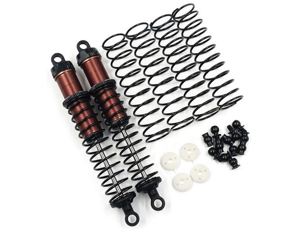 Big Bore Go! Purchase this set of big bore shocks, add oil and off you go! Includes two different types of mounting pillow ball studs for different types of cars! Included are different springs for you to fine tune your ride so you don't have to go looking for different springs after purchasing our set of shocks! If you really want to get serious with tuning, there are different holes of pistons included so you can adjust the how the shock reacts to the shock oil.