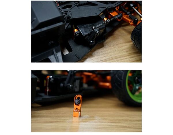 Aluminum servo mount will be a must have upgrade for all users still using plastic. With strong brushless servos nowadays, plastic might bend and buckle. You can also lift the servo off the chassis with this height adjustable servo mount!