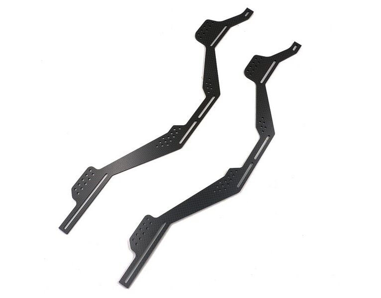 Graphite cut crawler frame rails for you to custom upgrade your rig to a graphite rails! By changing to these lighter rails, you will be effectively lowering the center of gravity whilst retaining the rigidity of the chassis! Long slits cut in the front, back and center for you to install your favourite bumpers, transmission cases and more! Specially cut damper mounting holes means you can tune the droop of your rig as well as placing your dampers in a position you want regardless of the wheelbase.