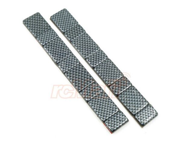 Our ultra-cool looking pre-cut lead weights in 5g and 10g pieces has gotten a carbon makeover. Which will help you achieve a sleek look whilst adding weight to a carbon fibre chassis. Add weight to a vehicle to gain steering, traction or simply gain better left to right balance on a vehicle. It also increases your crawler's front and rear wheel grip by sticking weights to your rim.
