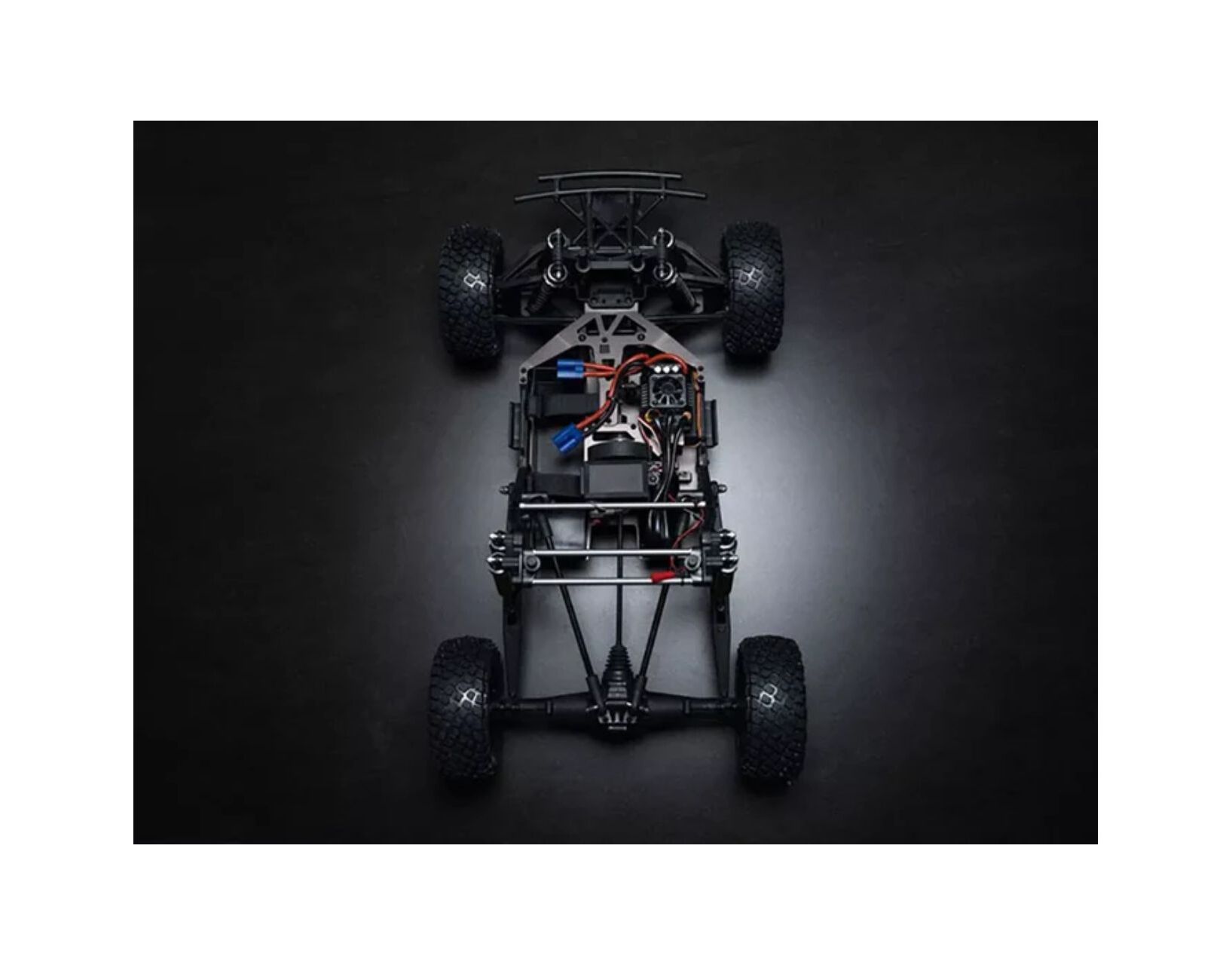 Der Desert Fighter ist speziell für den Outdoor-Einsatz optimiert. Das zeigt sich an den einzelnen Komponenten, die ihn robust und gleichzeitig agil machen. So bestehen die Antriebswellen aus extrem festem, vollständig bearbeitetem Stahl. Hinzu kommen acht Aluminium-Stoßdämpfer mit extra langem Hub und progressiven Federn sowie ein Jumbo-Servo mit satten 35 kg/cm Stellkraft. Die neu gestaltete Dreischicht-Aluminium-Chassis-Konstruktion sorgt für einen niedrigen Schwerpunkt und hervorragende Fahreigenschaften. Und für Fahrten bei Nacht ist der Desert Fighter natürlich ebenfalls mit einer LED-Lichtleiste und LED-Rücklichtern ausgestattet.